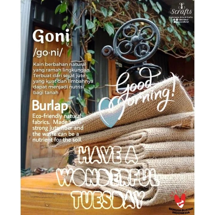 We produce our products using Burlap cloth. We called "GONI" in Bahasa Indonesia which means Burlap. The Burlap is made from Jute plants and its fiber is strong which is its waste for nutrients for the soil. The burlap is mostly sourced from West Java, Yogyakarta, and Bali. Therefore our creative houses are located in Bandung - West Java, Yogyakarta - Special Region of Yogyakarta, and Gianyar - Bali.